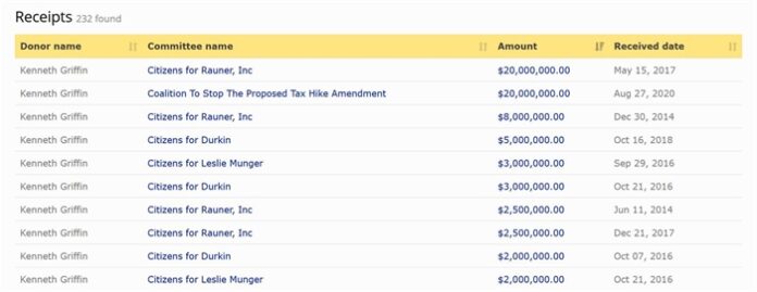 His recent $20 million donation went to the Coalition to Stop the Proposed Tax Hike Amendment ballot initiative committee. Prior to Griffin’s donation, the committee had received $950,000 in donations.