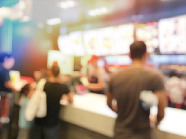 blurred image of people or customer waiting and queuing for order some food and make payment in Fastfood Store at cashier. vintage tone and light effect.