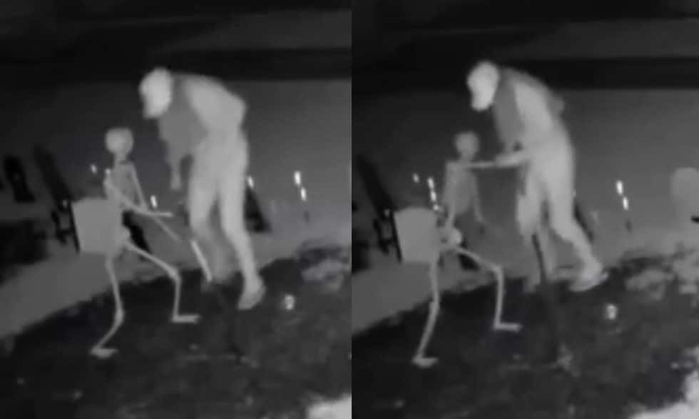 Early Sunday morning, a man was spotted just after 2:30 a.m. trying to apparently kidnap a decorative skeleton. But this isn’t your average bag of bones; the skeleton stood firm, refusing to be taken. Thwarted, the vandal then decided to damage it.Â