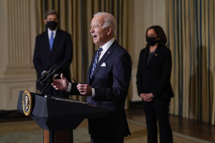 President Joe Biden delivers remarks on climate change and green jobs, in the State Dining Room of the White House, Wednesday, Jan. 27, 2021, in Washington. Vice President Kamala Harris, right, and Special Presidential Envoy for Climate John Kerry, left, listen. AP Photo/Evan Vucci
