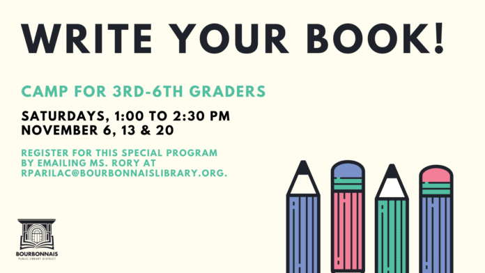 BOURBONNAIS – Next month is “National Novel Writing Month” and with it, kids in grades 3-6 are invited to begin work on their own book at the Bourbonnais Public Library!