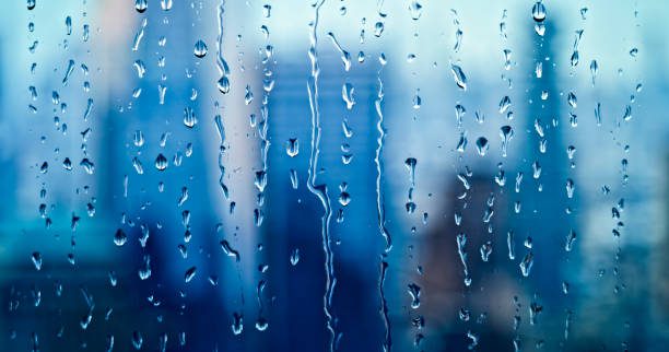 Close-up of cityscape with high rise buildings seen through wet glass window.
