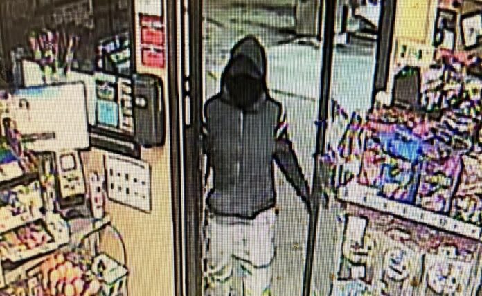 The robbery occurred at the 7-Eleven located on Route 66 around 2:30 a.m. The suspect, described as a male approximately 5’10”, wearing a black hooded sweatshirt, grey pants, black shoes, and gloves, entered the store and allegedly brandished a silver revolver. The suspect demanded money and cigarettes from the store clerk before fleeing on foot toward Route 66.