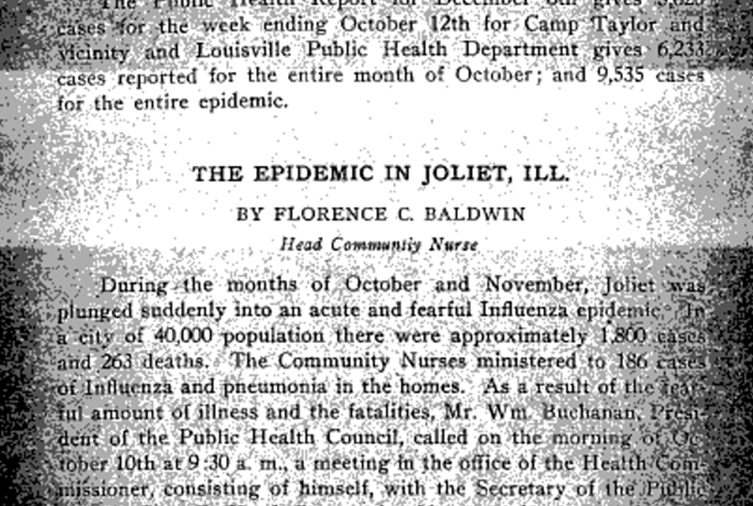 Below is the full journal entry of Florence C. Baldwin, one of eight Community Nurses in the City of Joliet during the pandemic. Florenceโs entry first appeared in The Influenza Epidemic and How We Tried to Control It.