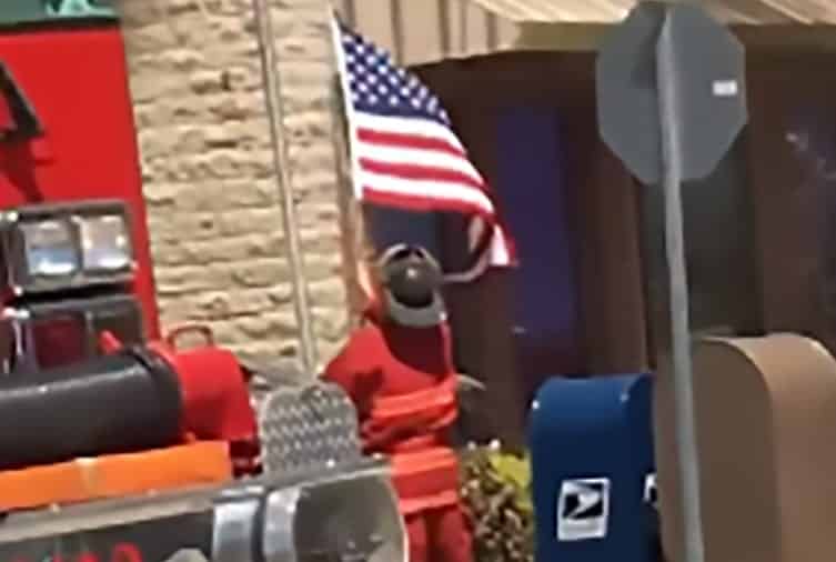 As flames climbed as high as 100 feet in the air, a Firefighter is shown in the video below, stops to save an American Flag in front of the Union Hill Post Office during the blaze Friday afternoon.