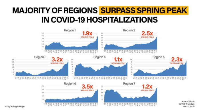 “Across the state, the majority of our regions are seeing far higher rates of hospitalizations for COVID-19 than they ever did last spring,” Pritzker warned residents. “Outside of Cook and the collar counties, much of Illinois’ communities are experiencing the worst surge they’ve seen yet.”