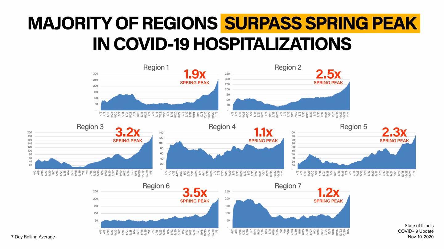 “Region 6, east-central Illinois, has now surpassed 3.5x its spring hospitalization rate. Even where things are not as awful, things are still bad. Region 4, the metro-east, and Region 7, Will and Kankakee counties, are running just above the worst that they saw in the spring, with no sign of slowing.” Pritzker warned Tuesday. “In short, we’re now just hundreds short of our worst COVID hospitalization numbers last spring, after adding more than 2,000 to that average since just October the 1st.”