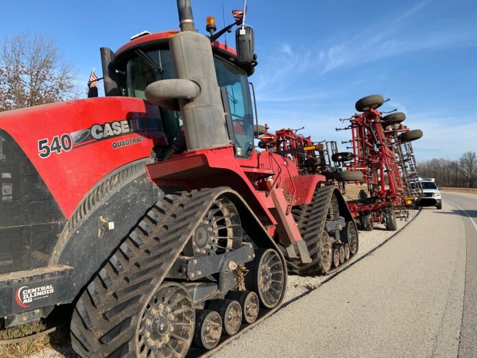 SPRINGFIELD  – Illinois State Police are reminding farmers this week not to drive heavy equipment on the Interstate after an officer pulled over a rather large piece of farm equipment for doing just that.