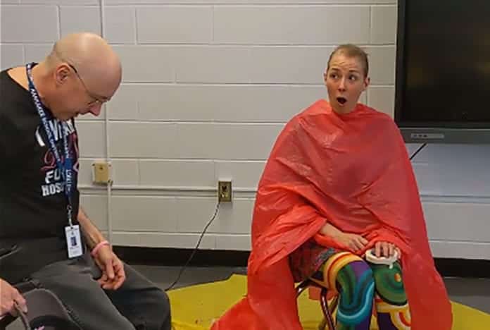 “Yeah, kinda.” She replies with a cringe while fellow Teacher, Chuck Lawrence carefully shaves her head. “Don’t cut my head. Just don’t cut my head.” She warns him with caution.