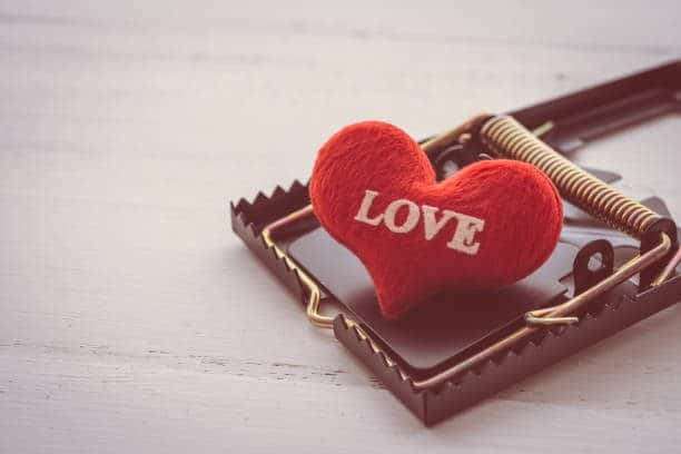Red heart in a mousetrap on white wooden background. Online internet romance scam or valentine day in darkside concept. Love is bait or victim.