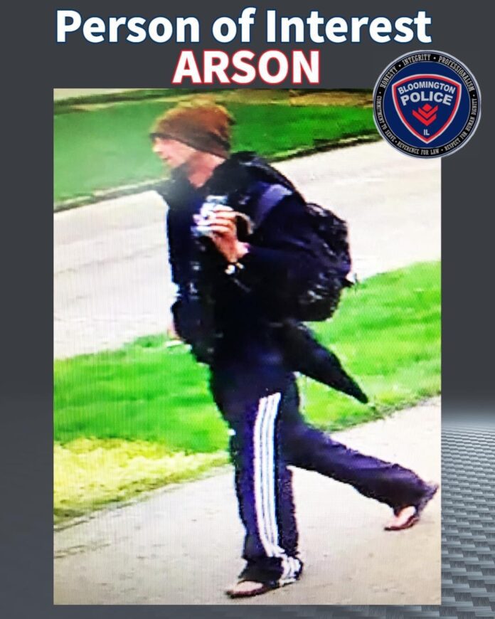 BLOOMINGTON, IL – The Bloomington Police Department is asking the public for assistance in identifying a person of interest in a string of deliberately set fires that occurred over the weekend across the far west side of Bloomington along W. Market and W. Washington streets.