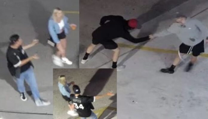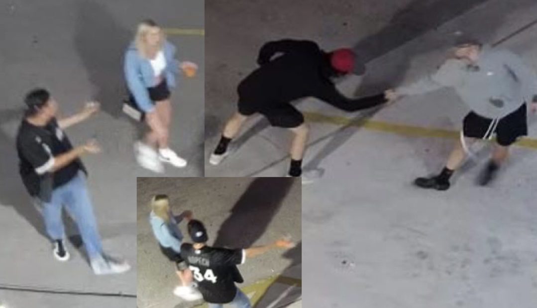 One of the male suspects was seen wearing a Chicago White Sox Kopech Jersey. Additional descriptions include a man in a black hoodie with black shorts and a red and Navy cap, another wearing a gray hoodie, black shorts, and a blue cap, and a woman with blonde hair wearing a blue jacket, white shirt, and black shorts.