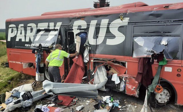The bus careened into a semi-truck and crashed through approximately 75 feet of guardrail before coming to a rest on its side. Miraculously, all occupants of the bus, who were later revealed to be aboard a party bus displaying the intriguing message “for a good time call…” on its rear, declined medical treatment at the scene.