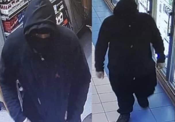 According to the employee, the suspect was a black male wearing a hooded sweatshirt, black sweatpants, and black shoes. He also had a mask covering his face and gloves covering his hands when he displayed a gun and demanded money from the cash register.