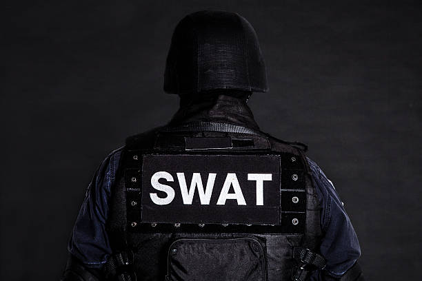 Special weapons and tactics (SWAT) team officer on black background shot from behind