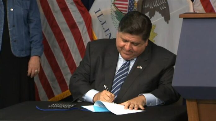 Gov. JB Pritzker signs a bill expanding access to family and medical leave benefits to part-time education workers in Illinois during a news conference Tuesday in Chicago. (Credit: Blueroomstream.com)